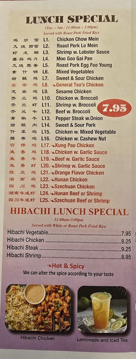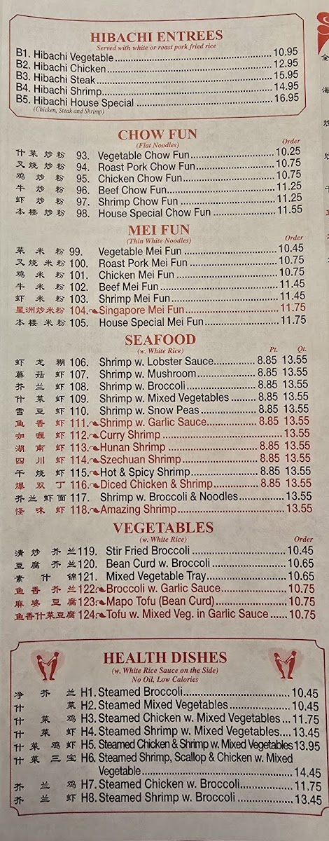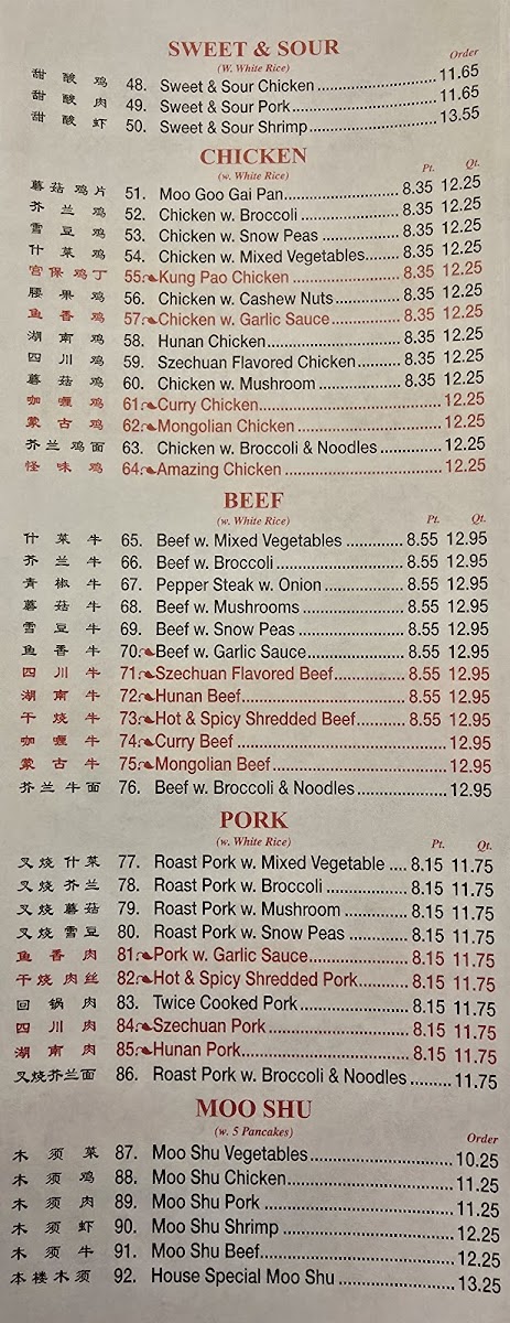For those craving a sweet twist, the Sweet & Sour dishes, featuring Chicken and Shrimp, are a must-try at $11.65 and $13.55, respectively. Additionally, the restaurant provides affordable side orders like Crispy Noodles and White Rice to complement your meal.